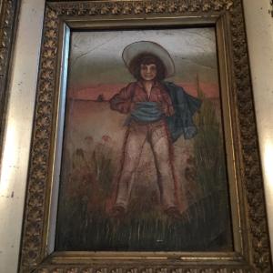 Antique 19th C American Folk Art Primitive Oil Painting Boy Cowboy Outfit AAFA
