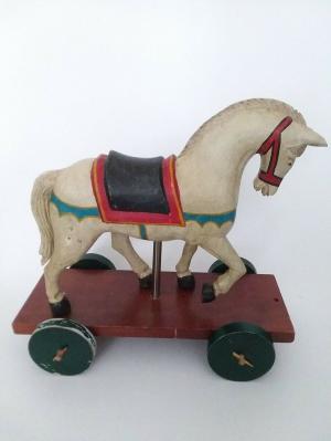 Nice Old American Folk Art Miniature Carousel Horse Pull Toy Wood Carving