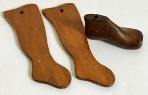 Vtg Primitive Wood Child''s Stocking Stretcher Set 10" L & Child''s Shoe Last 5" L