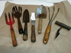 7 VTG LOT Wood hand tool garden yard claw cultivator digger fork shovel dibber