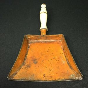19th c. Antique Painted TINWARE CRUMB TRAY with TURNED HANDLE, Persimmon, AAFA