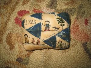 Primitive tiny Sampler Pillow~1725 Three Kids & a Dog ~Early Quilt~ Folk Art