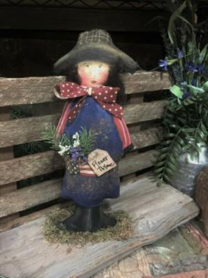 *Primitive 13x6in GARDEN GAL USA ON BASE FABRIC HANDMADE Country old rusty doll*