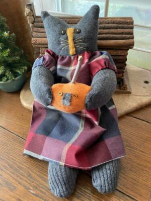 Primitive Kitty Cat Polly with Prim Pumpkin JOL Halloween Harvest Autumn
