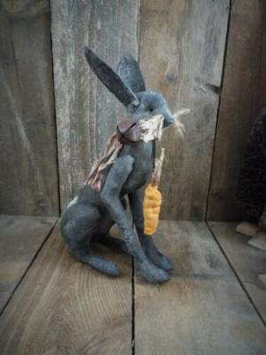 Primitive Black Jack Rabbit Doll W/ Mini Carrot - shelf Sitter Rustic