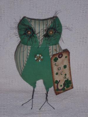 Primitive Owl Doll~Green Stripe~Folk Art~Free Standing~St. Patrick's Day