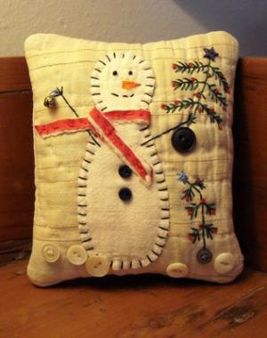 Primitive Tiny Folk Art Snowman Christmas Tree Pillow From Vintage Quilt Piece