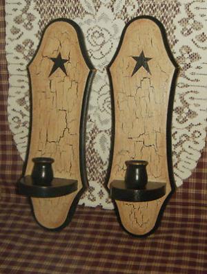 Primitive Vintage Wood Sconces Candle Holders~Tan Crackle~Country~Farmhouse