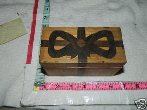 VINTAGE ANTIQUE PRIMITIVE gift bow STORAGE BOX FOLK ART inlaid wood wooden