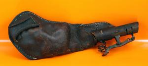 OLD ANTIQUE LEATHER SHOT POUCH, METAL SPOUT, LEAD SHOTGUN PELLETS - NO MAKER