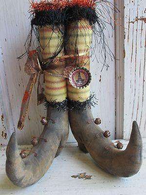 Primitive Halloween Witch Boot Tucks w/Striped Stockings~Sewmany Stitches