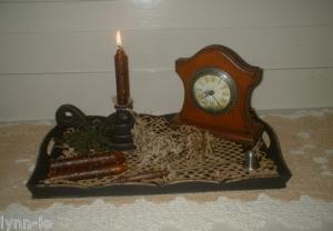 Primitive~Wooden Canted Tray~Mantel Clock~Candle~Side Table Homestead Gathering