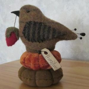 PRIMITIVE WOOL BIRD STRAWBERRY VELVET MAKE DO PIN CUSHION SEWING PFATT