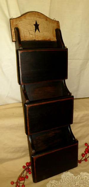 PRIMITIVE WOOD MAIL BILL LETTER HOLDER KEY RACK BLACK TAN CRACKLE COUNTRY DECOR