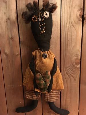 Extreme Primitive Folk Art Doll w Crow Doll Calico Rusty Bell **Signed/Dated