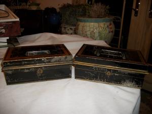 2 Antique Primitive KREAMER Tole Paint Metal Tin SPICE Lock Cash BOX with Handle