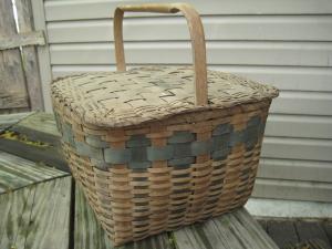 Antique Blue Dyed splint Feather Basket w lid,Carved Handle, Penobscot