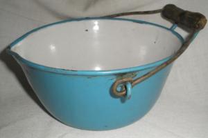 Antique Blue Granite Ware Batter Bowl with pour spout and Bail Handle GERMANY