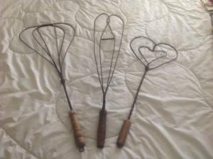 3 PRIMITIVE ANTIQUE RUG BEATERS METAL DESIGNS & WOODEN HANDLES