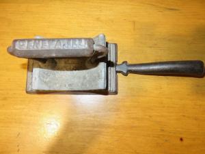 VICTORIAN 1866 CAST IRON HAND FLUTER CRIMPER IRON GENEVA ILL. W/ BASE & HANDLE
