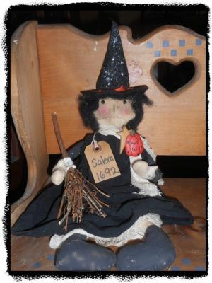 Primitive Handmade`Witch Doll with Broom`Sparkly Hat`Pumpkin Pin` Salem 1692