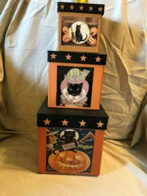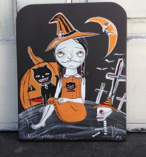 Original Halloween Witch ,creepy cat acrylic painting on wood board Alena Sinel