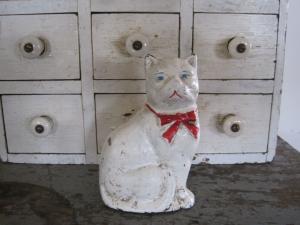 Antique Primitive Original Paint Metal Cat Bank White Body Red Bow Blue Eyes
