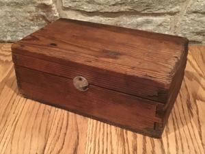 Antique Handmade Solid Wood Box, Dovetail Corners,1943 2 Francs Coin Closure