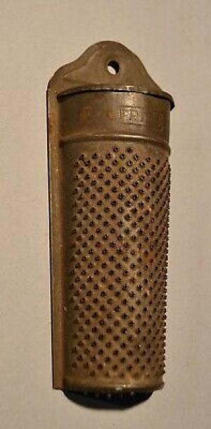 Antique Tinware Wall Hanging FRIES Nutmeg Spice Cinnamon Grater Storer w Lid