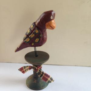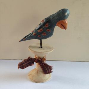 Primitive Hand Carved Wooden Folk Art Bird On Green Spool