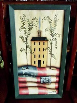 Primitive Saltbox Americana Sheep Sliney Land of Freedom Framed Print 21" x 11"