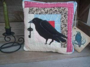 Antique Primitive Folk Art Black Crow Raven w/ Key Quilt Pillow