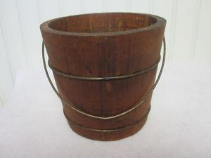 Vintage Wooden Bucket Pail-Old Primitive Folk Art-Metal Bands & Handle-WOOD
