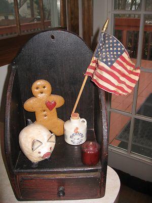 PRIMITIVE VINTAGE HANGING WOOD BOX SHELF & DRAWER BURGUNDY STAINED