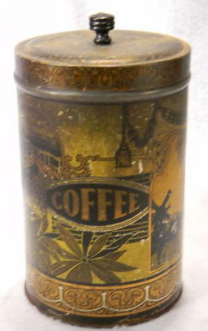 ANTIQUE COFFEE TIN POINSETTIAS WOODEN HANDLE
