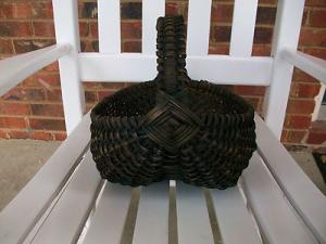 ANTIQUE VINTAGE LG SPLINT WOOD BUTTOCKS BASKET IN GREAT DARK BROWN/GRAY PAINT!
