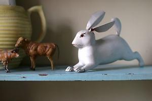Old wooden white rabbit bunny metal ears hand painted vintage antique carving