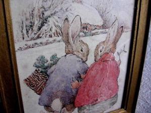 Antique VtG COTTAGE Painting ANTHROPOMORPHIC RABBITS GATHERING HERBS IN BASKET