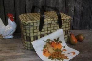 Vintage 1950's TIN Metal Country Picnic Basket + Matching Tea Towel SET