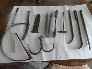 Lot of 12 Antique 1800's Primative Wrought Iron Blacksmith Lumberman Tools