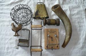 Vintage Antique - Farm - Primitive -Junk Drawer Lot Cast,Traps,Bell,Powder Horn