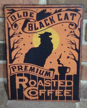 PRIMITIVE HANDPAINTED WOOD HALLOWEEN SIGN “OLDE BLACK CAT PREMIUM ROASTED COFFEE