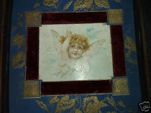 Vintage , antique wood box,with cover, shelf inside, picture angel ,