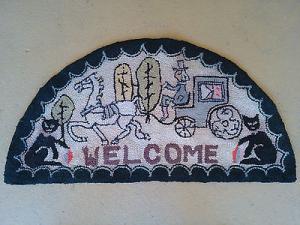 Halloween themed Primitive Hooked wool Rug cats stagecoach caskets half round