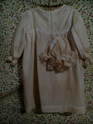 Primitive prairie pioneer little dress tan pin stripe calico with bonnet