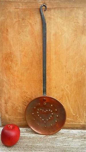 Vintage Copper Skimmer Ladle with Heart Shape Punched Holes & Long Iron Handle