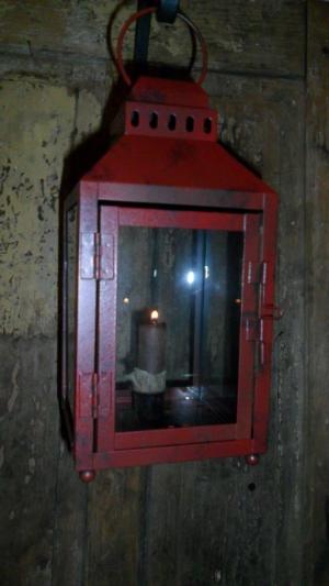 Primitive Metal Lantern, Early Look Homestead Candle Light, Antique Red w/ Stub