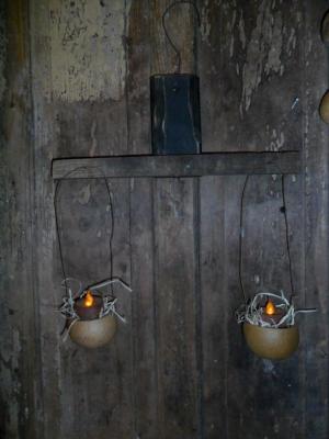 Primitive Dried Gourd Lights, Pair Hanging Gourd Bowls, Candles w/ Rusty Wire
