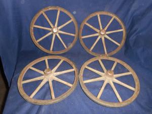 4 ANTIQUE WOODEN SPOKE WHEELS FROM A WICKER DOLL CARRIAGE 10" DIAMETER