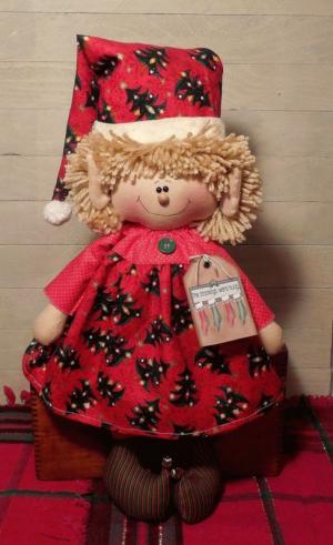 Primitive Handmade CHRISTMAS RAGGEDY ELF DOLL in Christmas Tree Dress Folk Art